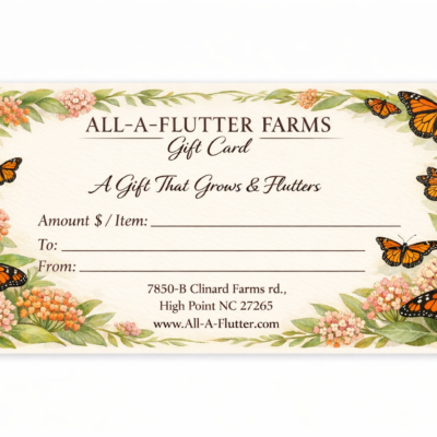 Coordinates for conservation is a crucial part of All-A-Flutter Farms “Meadows for Monarchs” initiative. Our mission is to allow anyone across America to join us in helping restore habitat for the nearly endangered Monarch butterfly. No matter which option you choose you are teaming up with All-A-Flutter to take REAL action in planting vital host plants back into the Monarch’s habitat - with a Milkweed plant that YOU provided! Plus, every option includes a packet of Milkweed seeds for you to plant in your own backyard. Our staff scout & identify the best areas for native Milkweed to thrive, we focus on areas where deforestation and development have already occurred. Staff plant the Milkweed as close as possible to these negatively impacted areas. We then record the GPS coordinates onto your certificate, you can easily enter the coordinates into Google Earth and get a satellite view of the exact location your plant LIVES! Help us restore habitat across the East Coast with the click of a button! The future of the Monarch population is depending on you! Join us today! Check out the shop below, all items are meant to promote the Education | Conservation | Habitat Restoration of the Monarch Butterfly & all our beloved pollinators!